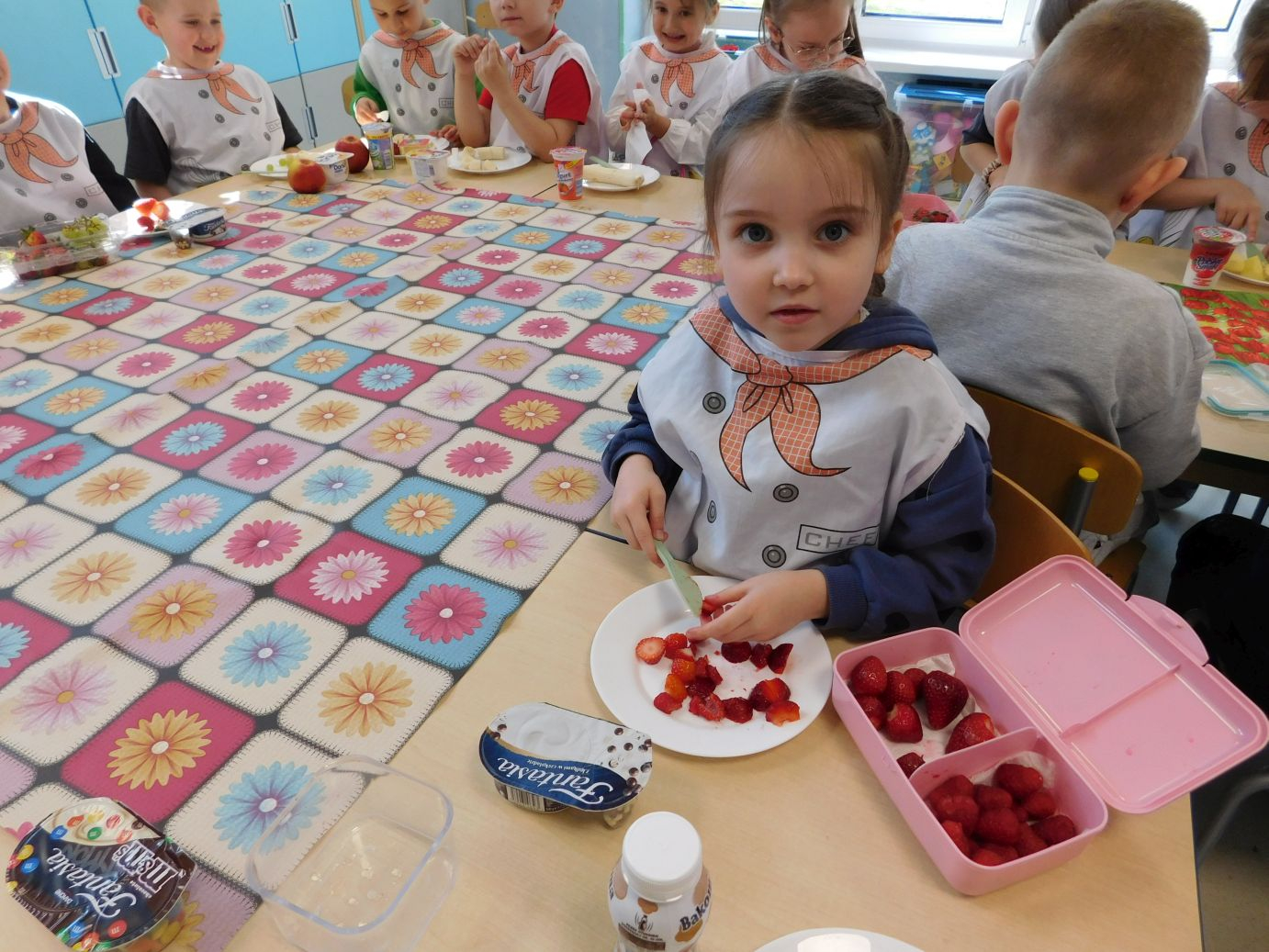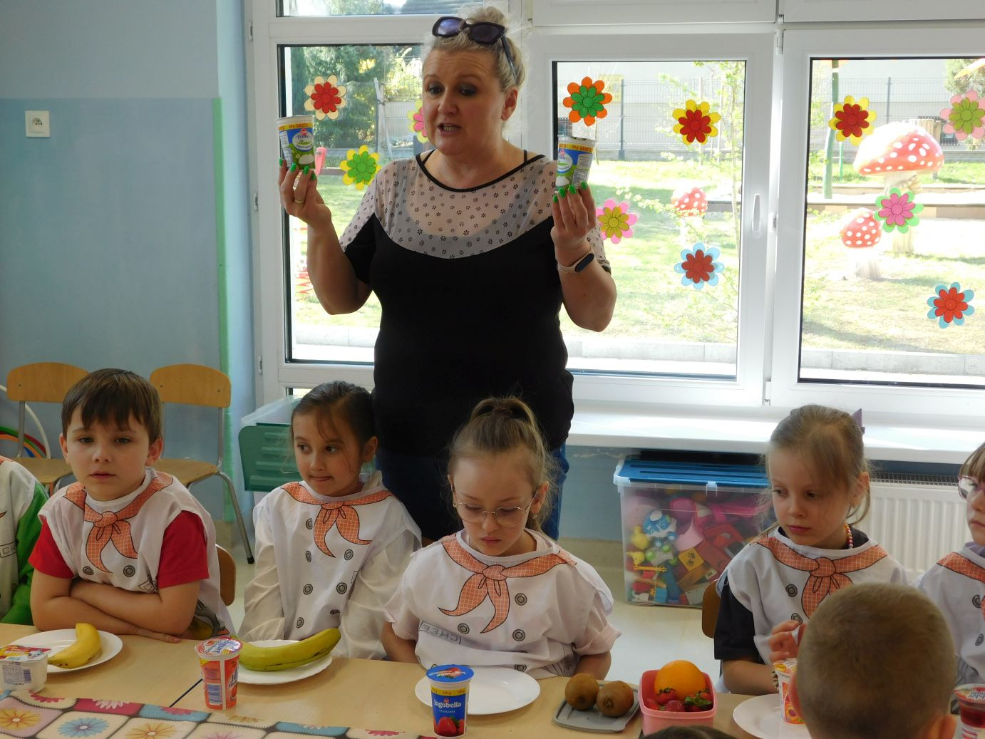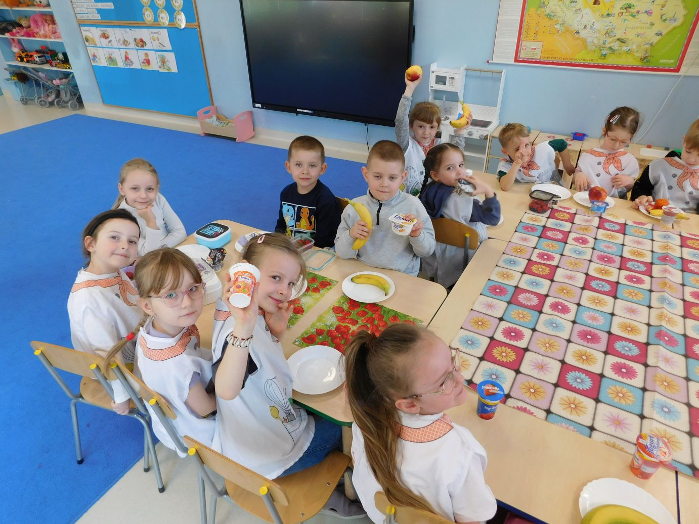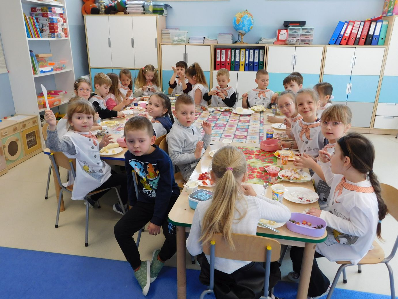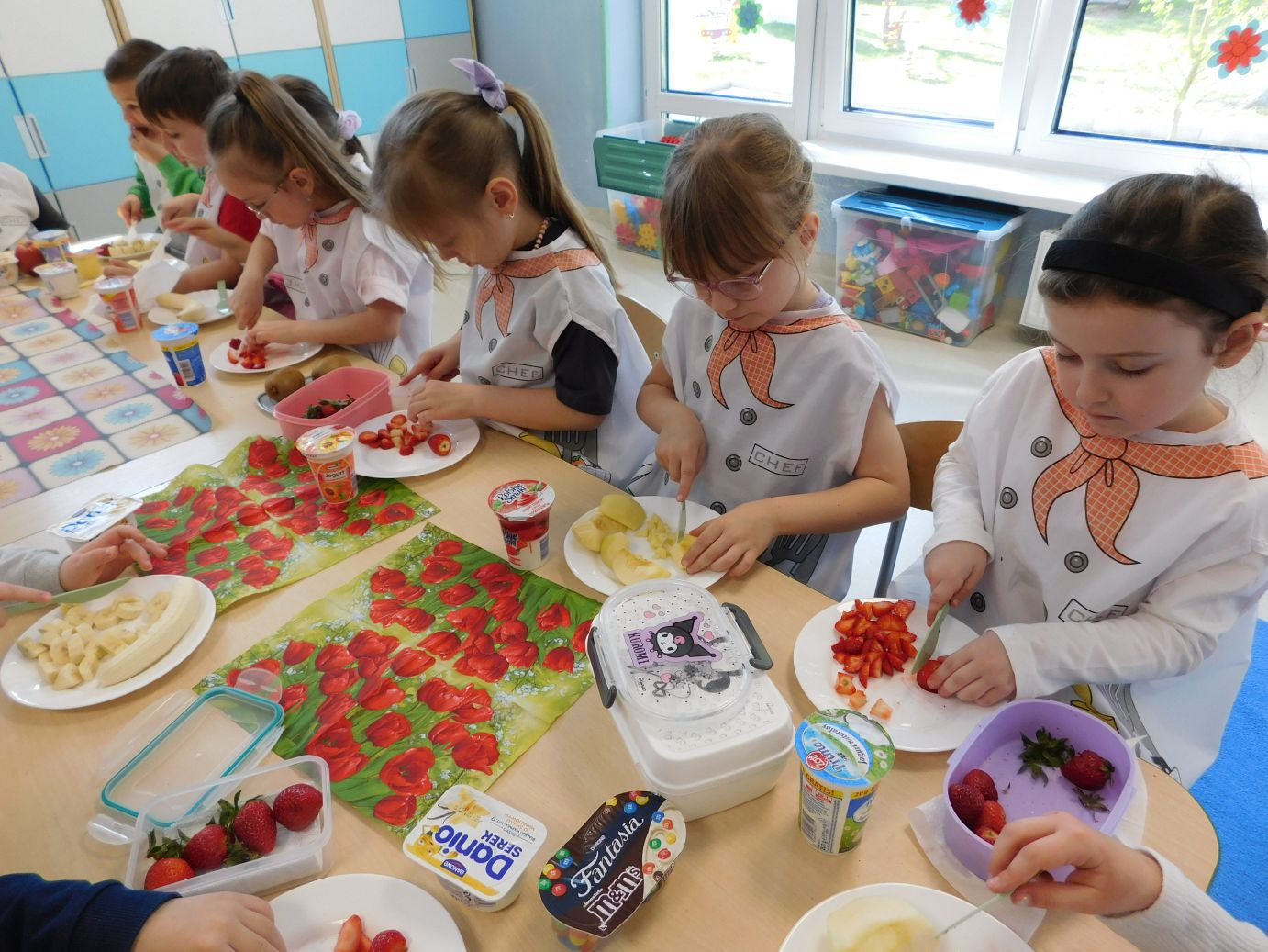 OWOCOWE-PRZYSMAKI-28W grupie Jagódek w piątek 17 kwietnia odbyły się zajęcia kulinarne, podczas których dzieci przygotowywały pyszne deserki z ulubionych owoców i jogurtów. Przedszkolaki z dużym zaangażowaniem dobierały składniki, kroiły owoce i komponowały własne, kolorowe desery. Zajęcia sprawiły dzieciom wiele radości, a przy okazji były świetną okazją do nauki zdrowych nawyków żywieniowych oraz rozwijania samodzielności.