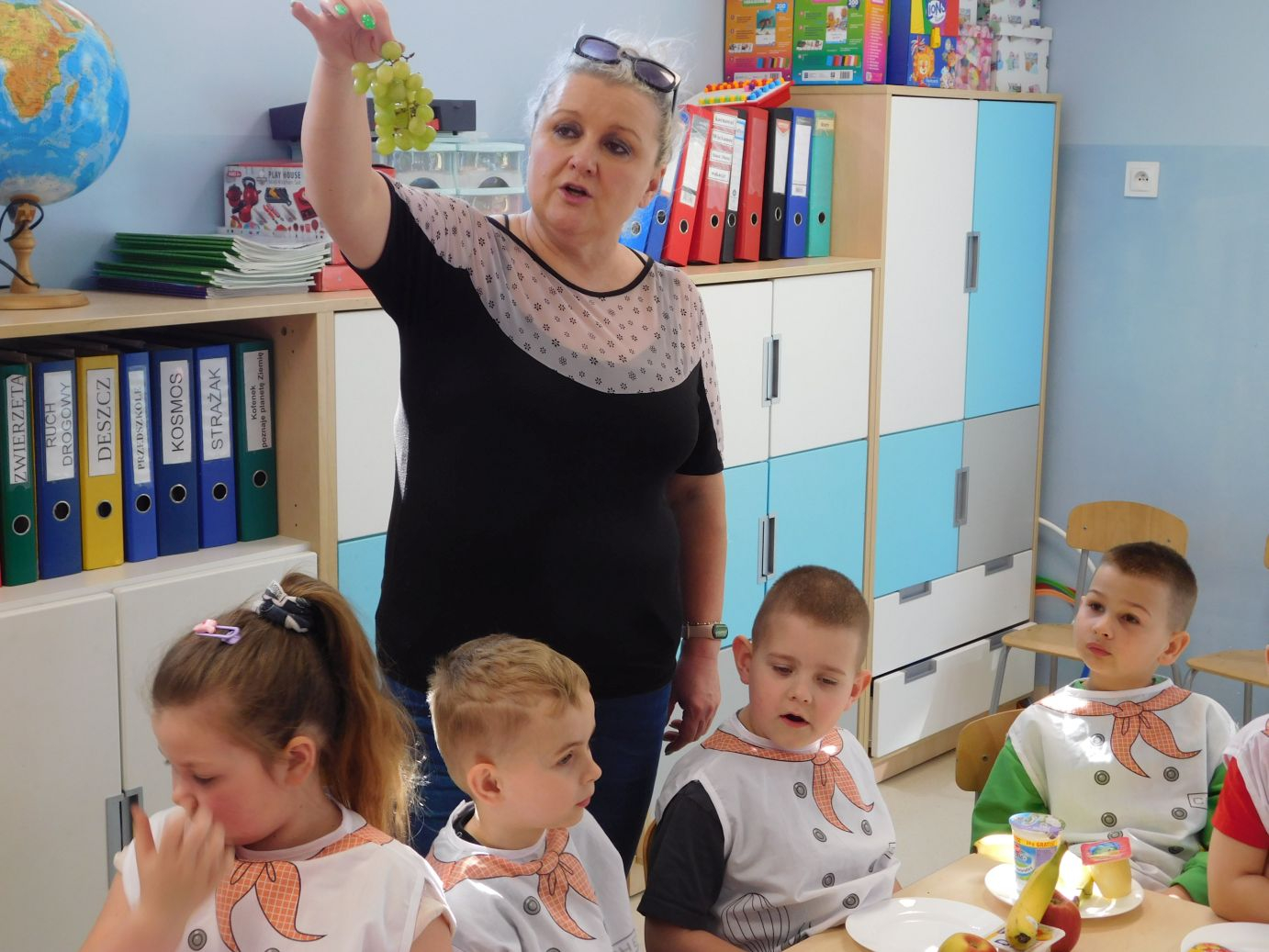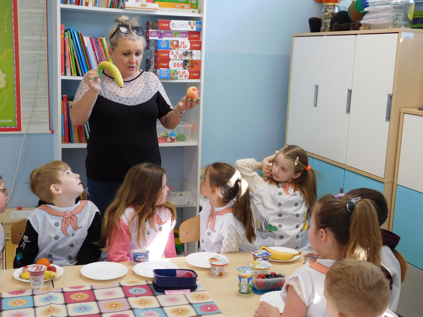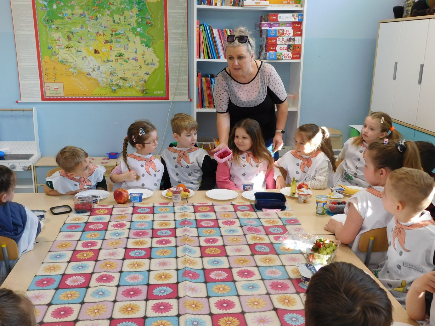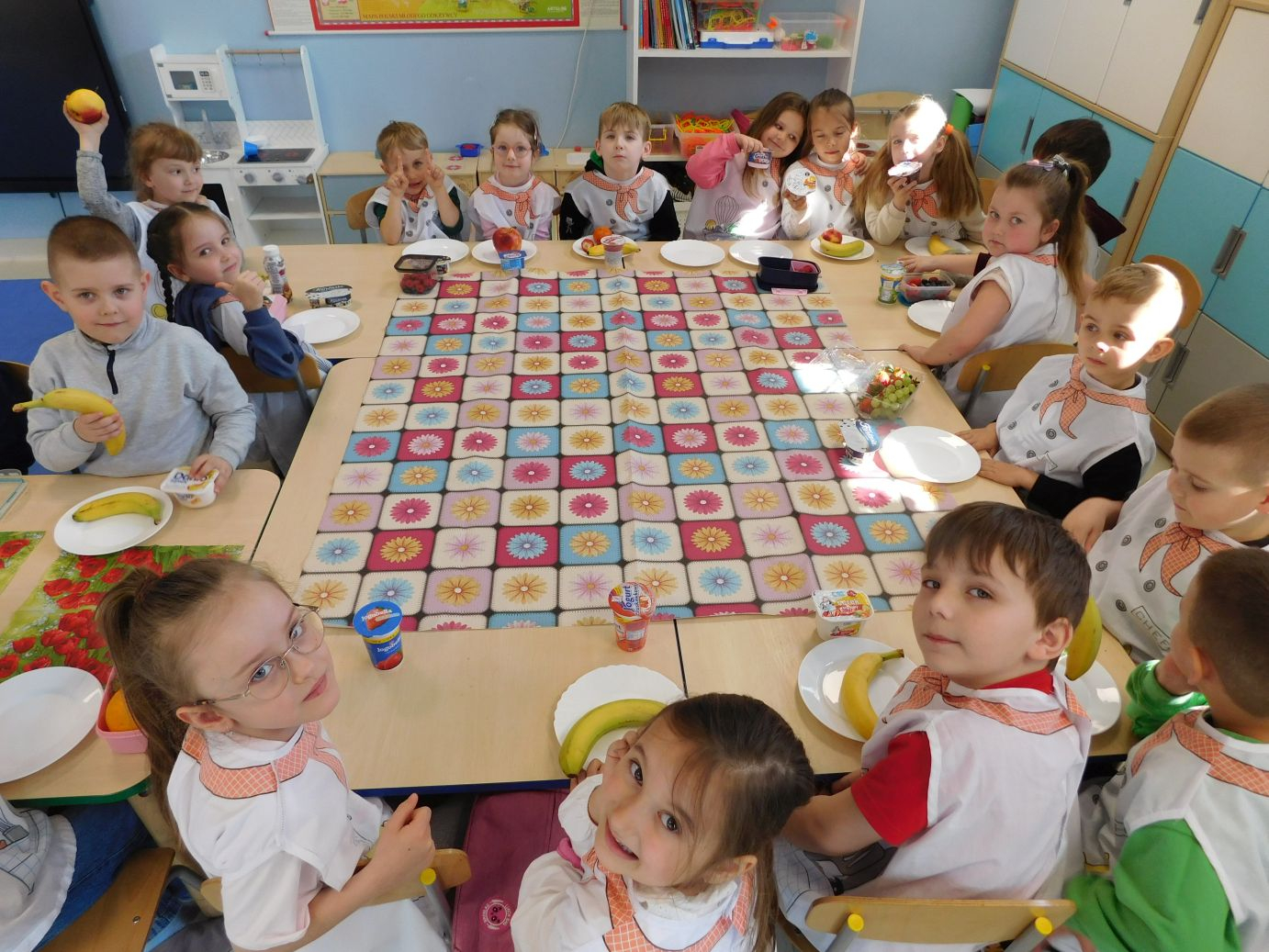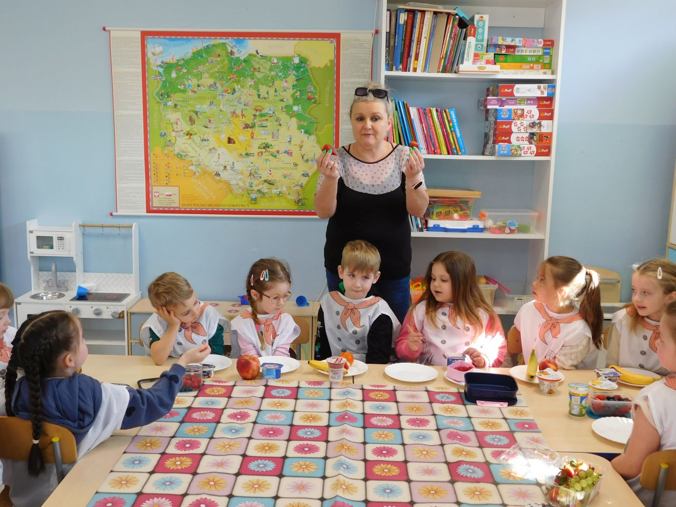 OWOCOWE-PRZYSMAKI-28W grupie Jagódek w piątek 17 kwietnia odbyły się zajęcia kulinarne, podczas których dzieci przygotowywały pyszne deserki z ulubionych owoców i jogurtów. Przedszkolaki z dużym zaangażowaniem dobierały składniki, kroiły owoce i komponowały własne, kolorowe desery. Zajęcia sprawiły dzieciom wiele radości, a przy okazji były świetną okazją do nauki zdrowych nawyków żywieniowych oraz rozwijania samodzielności.