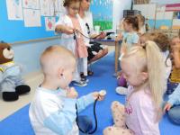 W piątek 24 maja w grupie Jagódek obyły się zajęcia z cyklu: Kto nam pomoże? Naszą grupę odwiedziła Pani doktor Anna Pierścińska, która opowiedziała dzieciom na czym polega praca lekarza, jak bardzo jest odpowiedzialna i co należy robić i jeść żeby być zdrowym. Pani doktor przyniosła także ze sobą do przedszkola: stetoskop, patyczki do sprawdzania gardła, młoteczek neurologiczny, ciśnieniomierz i recepty. Przedszkolaki dostały od Pani Ani fartuszki, dzięki czemu mogły poczuć się jak mali lekarze. Bardzo dziękujemy Pani doktor za tak ciekawe przeprowadzone zajęcia.