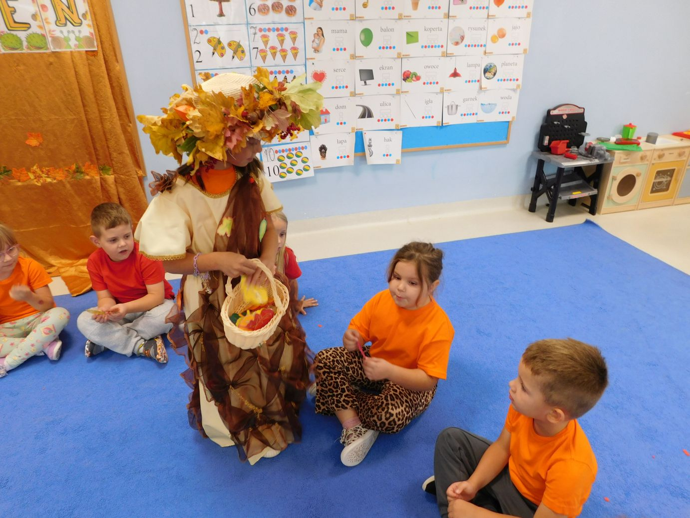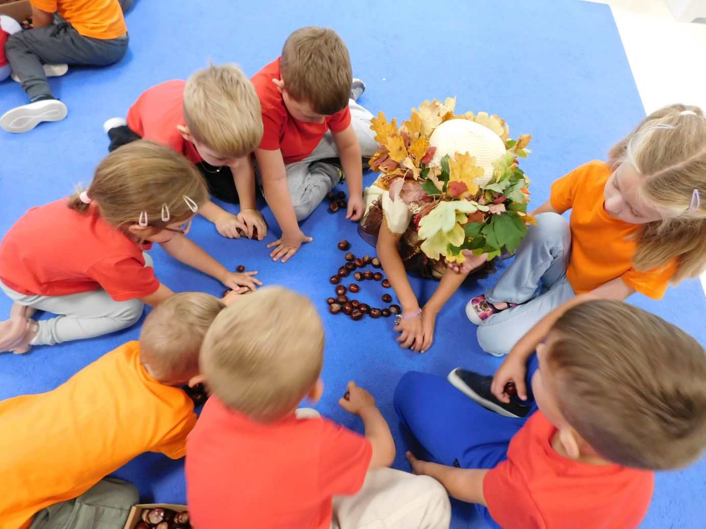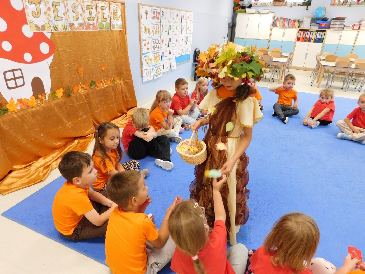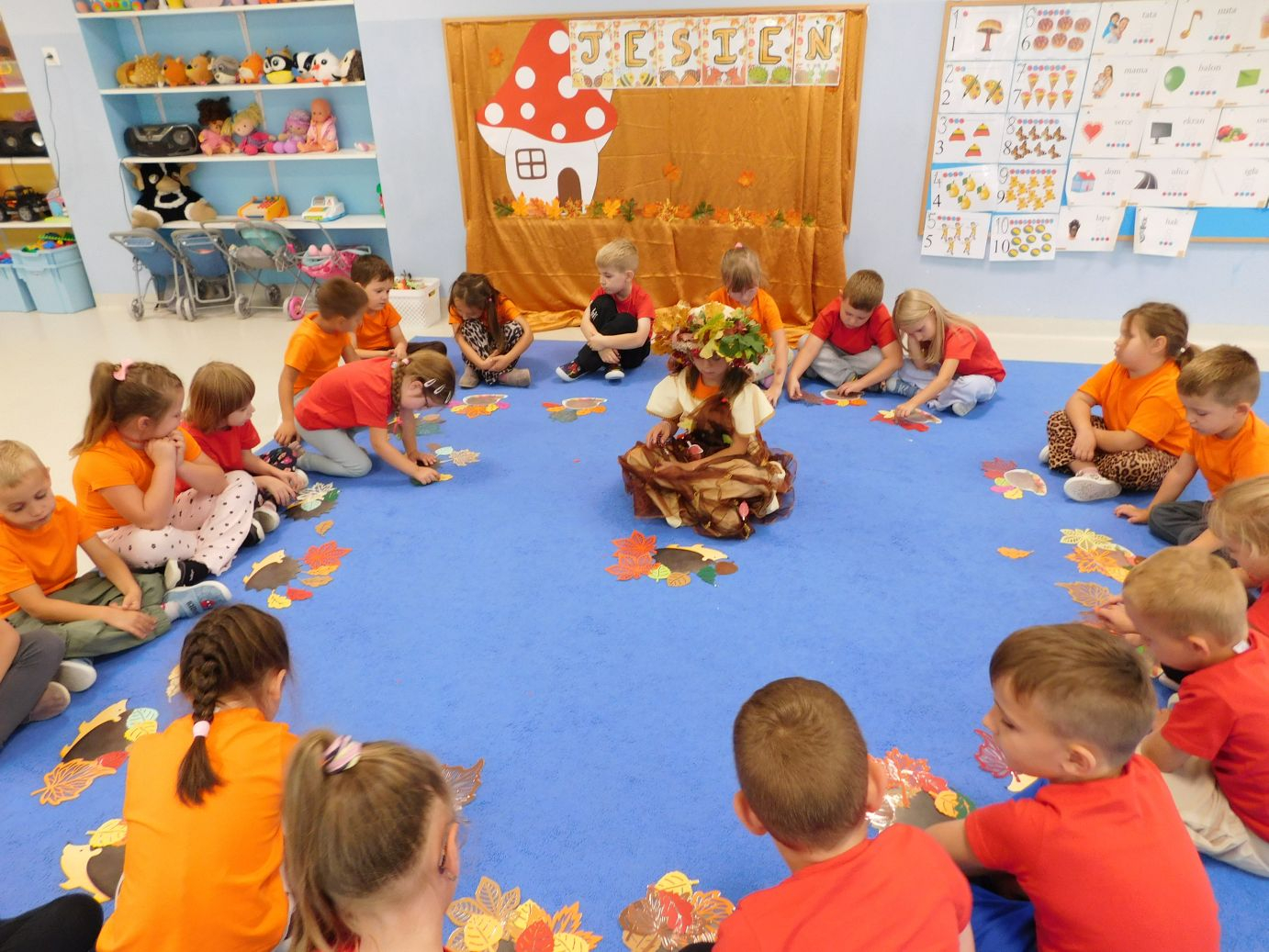 W środę 24 września w grupie Jagódek odbyły się zajęcia tematyczne pt. „Dary jesieni z Panią Jesienią”. Dzieci spotkały się z Panią Jesienią, która przyniosła kosz pełen jesiennych skarbów: kolorowe liście, kasztany, żołędzie, szyszki i orzechy. Przedszkolaki rozpoznawały i nazywały dary jesieni, a także tworzyły jesienne kompozycje z zebranych materiałów. Zajęcia dostarczyły dzieciom wiele radości, rozwijały ich spostrzegawczość, wiedzę o porach roku oraz integrowały grupę poprzez wspólną zabawę.
