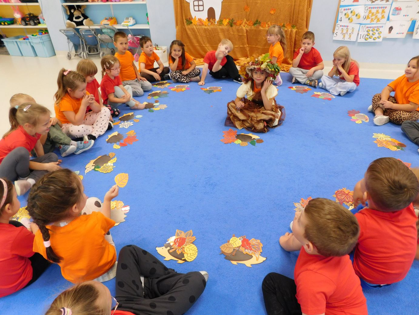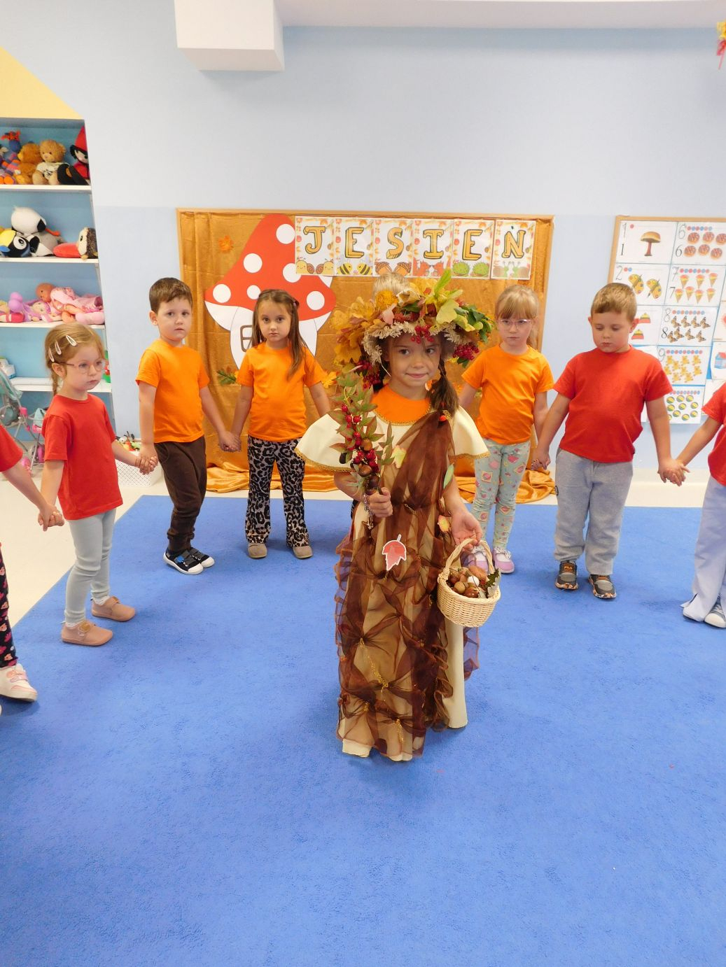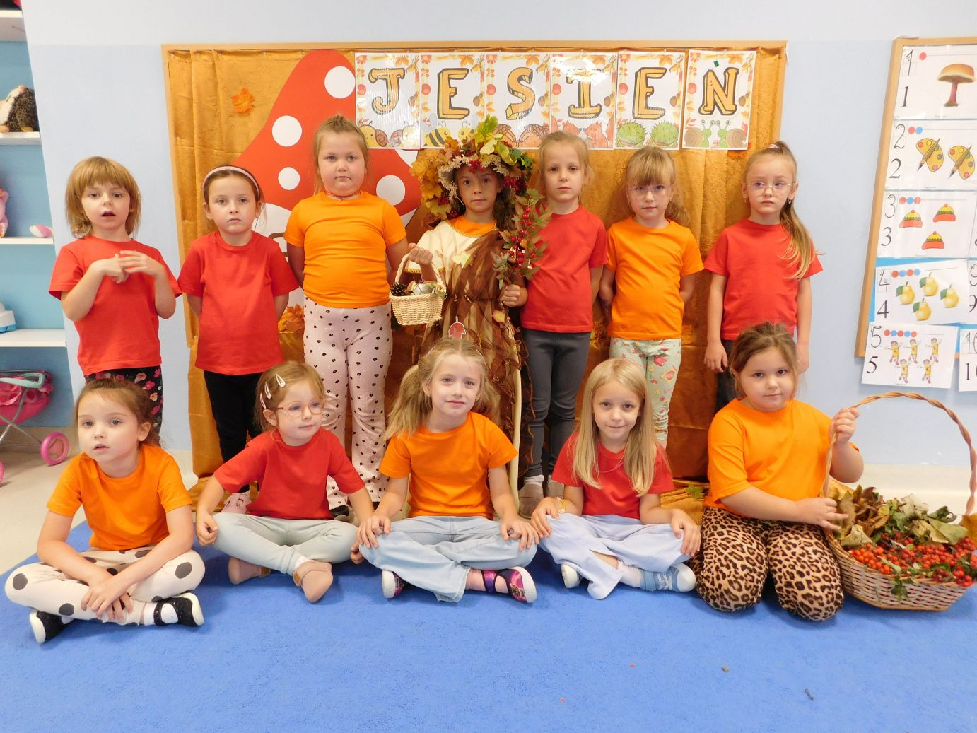 W środę 24 września w grupie Jagódek odbyły się zajęcia tematyczne pt. „Dary jesieni z Panią Jesienią”. Dzieci spotkały się z Panią Jesienią, która przyniosła kosz pełen jesiennych skarbów: kolorowe liście, kasztany, żołędzie, szyszki i orzechy. Przedszkolaki rozpoznawały i nazywały dary jesieni, a także tworzyły jesienne kompozycje z zebranych materiałów. Zajęcia dostarczyły dzieciom wiele radości, rozwijały ich spostrzegawczość, wiedzę o porach roku oraz integrowały grupę poprzez wspólną zabawę.