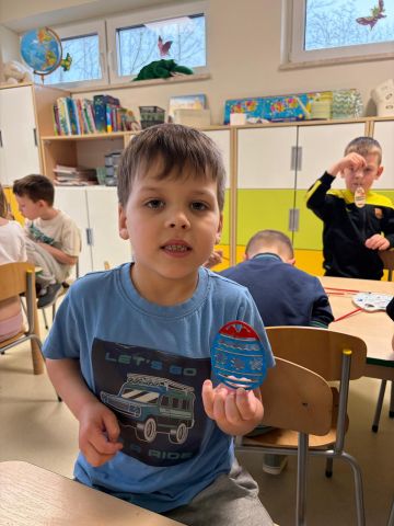 Nie zabrakło również zajęć plastycznych – dzieci kolorowały drewniane jajeczka pastelami, rozwijając swoją kreatywność i zdolności manualne. Powstały przepiękne, kolorowe prace, które wprowadziły nas w świąteczny nastrój.