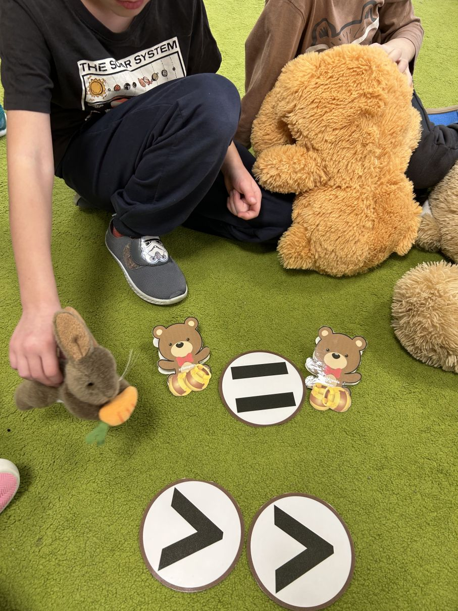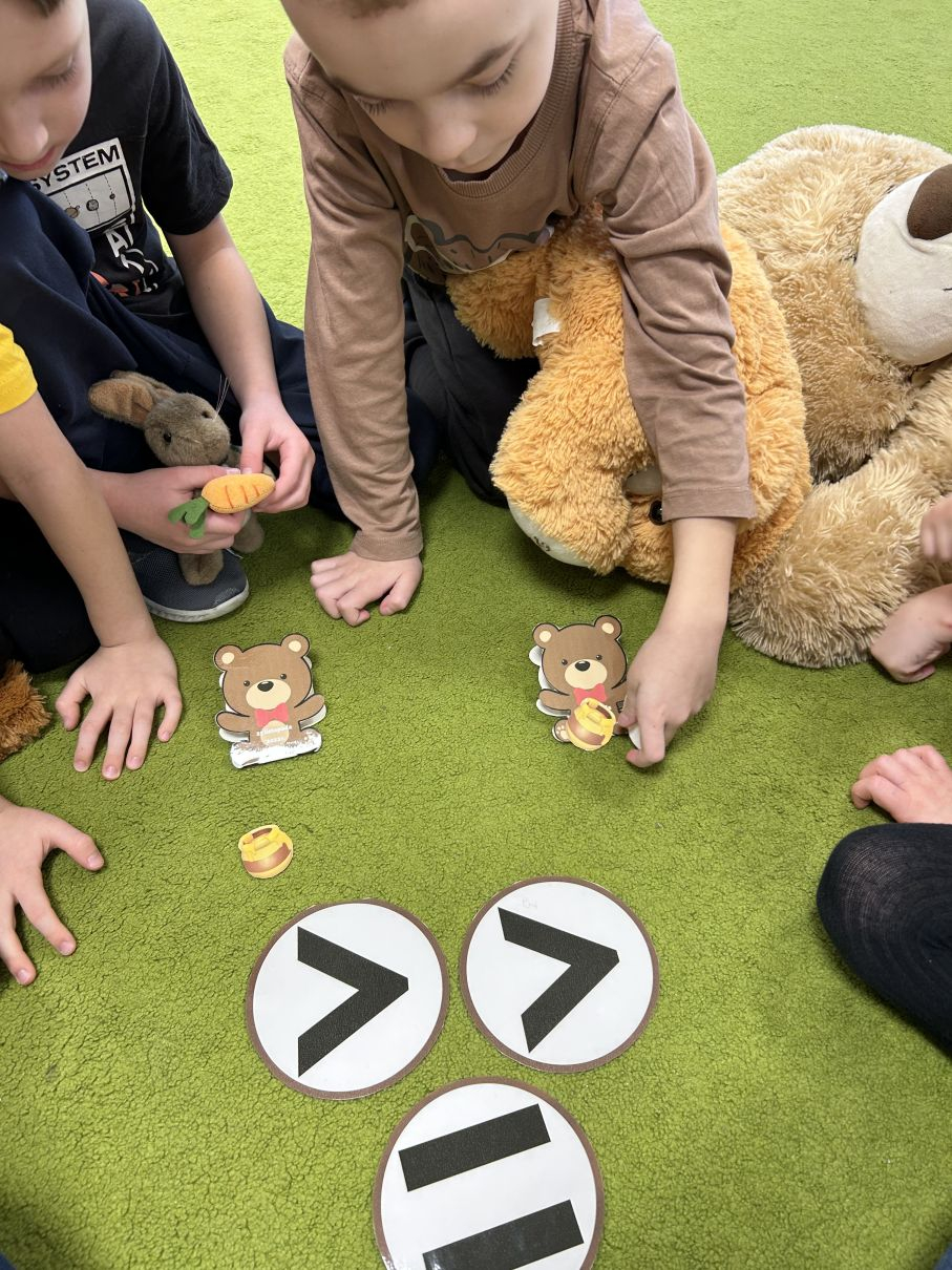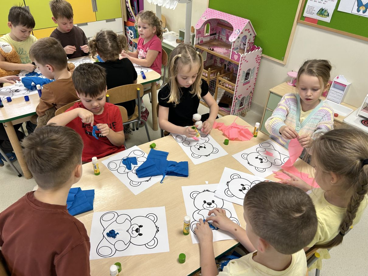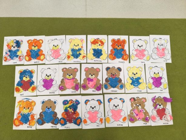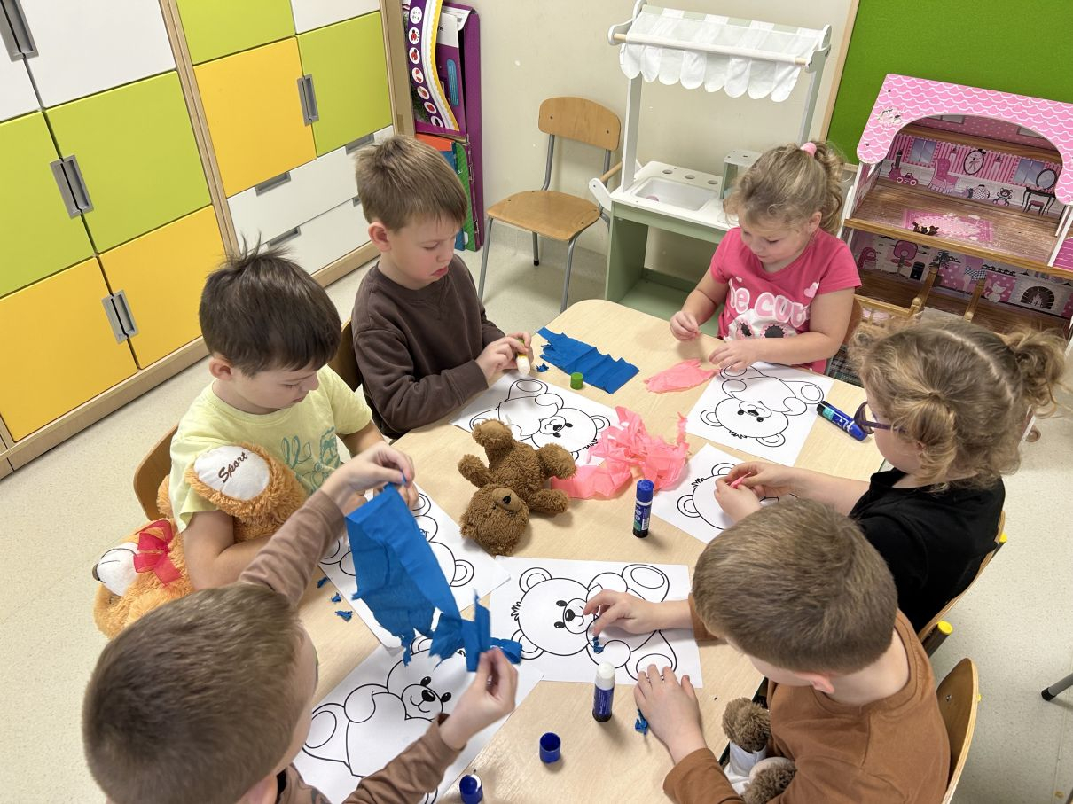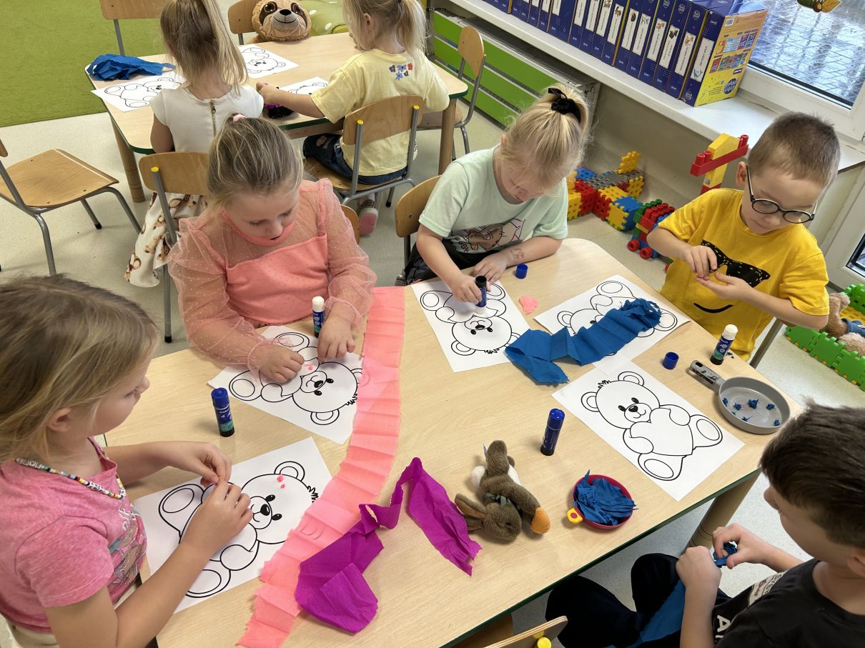 Wykonaliśmy pracę plastyczną – wyklejankę przedstawiającą misia z kolorowego papieru. Śpiewaliśmy piosenki o misiach, a w części matematycznej porównywaliśmy „miodki misiów”, używając znaków większości, mniejszości i równości.