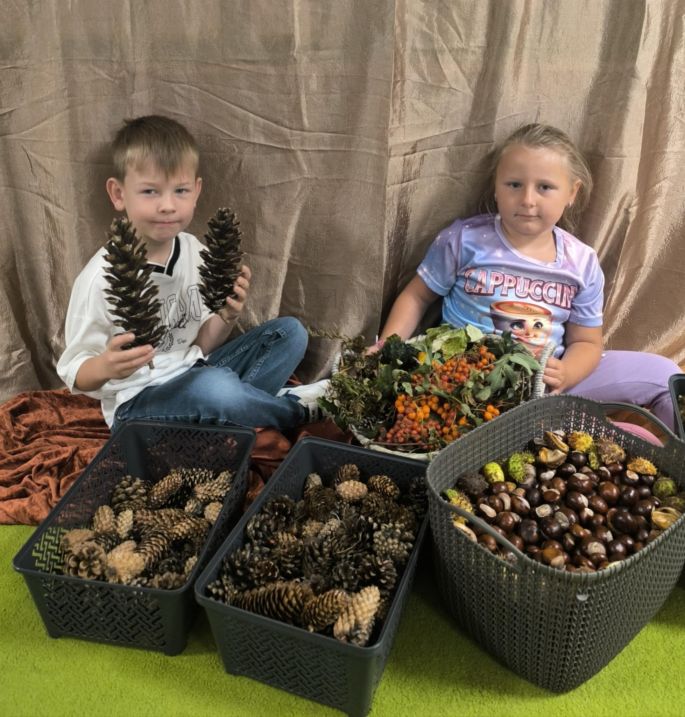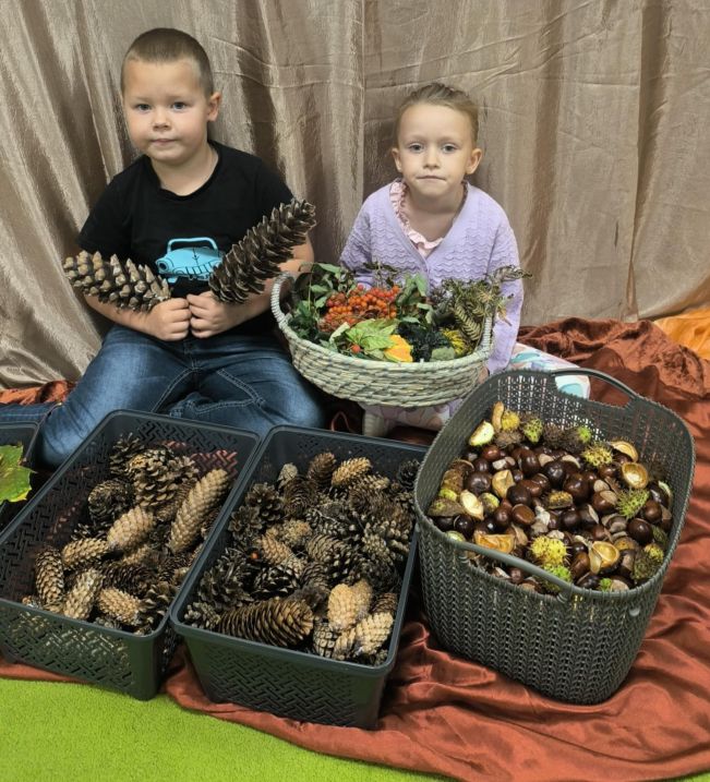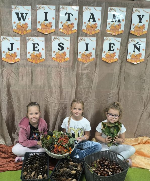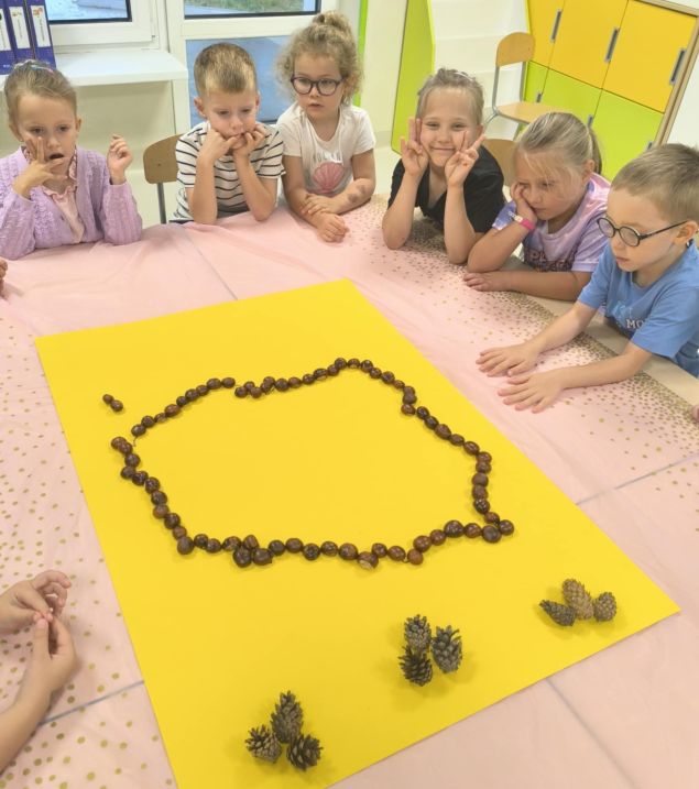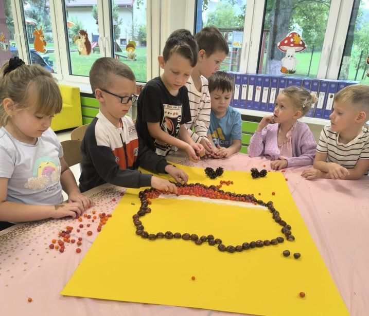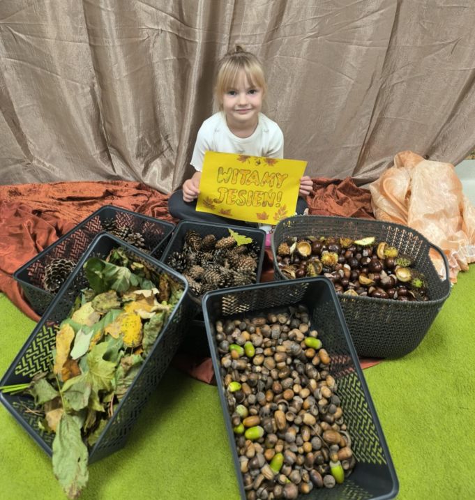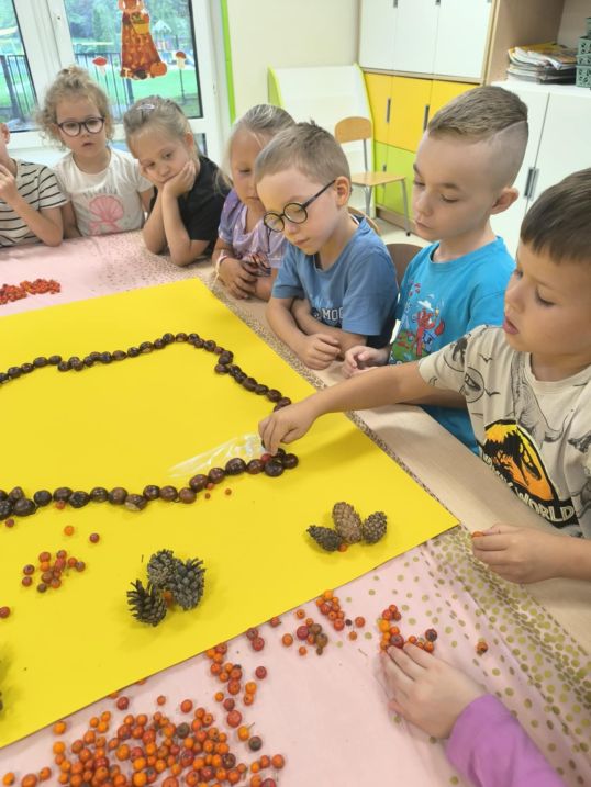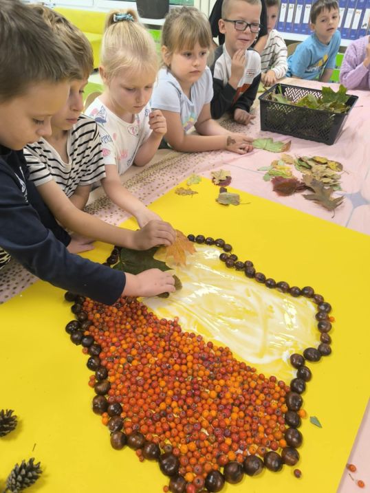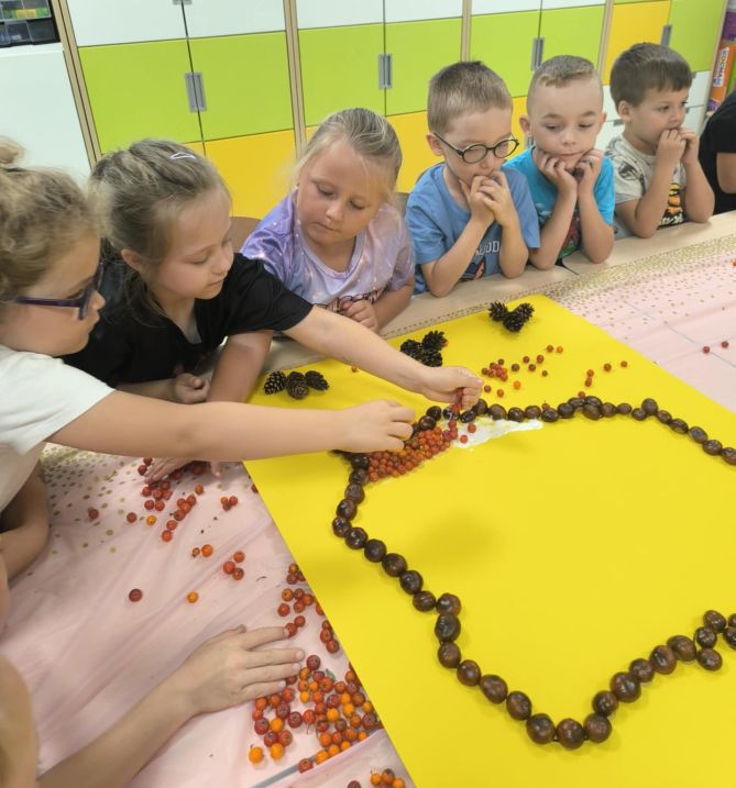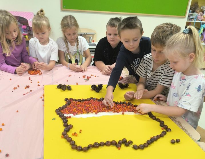 Odwiedziła nas sama Pani Jesień – przyniosła kosz pełen darów. Dzieci wspólnie z niezwykłym gościem zaśpiewały i zatańczyły jesienną piosenkę , a następnie z wielkim zaangażowaniem wykonaliśmy zadanie z projektu ,,Sensoryczna podróż po Polsce - poznaj Polskę wszystkimi zmysłami" gdzie zadaniem było wykonanie mapy Polski z darów natury.