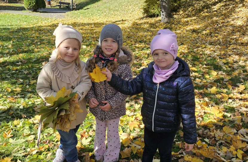 Podczas wspólnych wędrówek po okolicy dzieci obserwowały, jak zmienia się przyroda jesienią – zauważały kolorowe liście spadające z drzew i kasztany ukryte w trawie.
