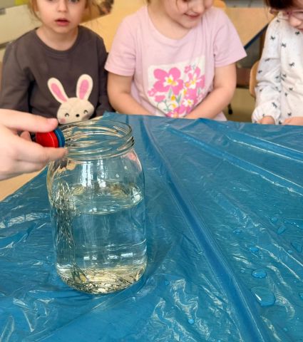 Głównym punktem dnia były fascynujące eksperymenty, które pozwoliły dzieciom poznać właściwości wody wszystkimi zmysłami, między innymi zrobiliśmy eksperymenty: