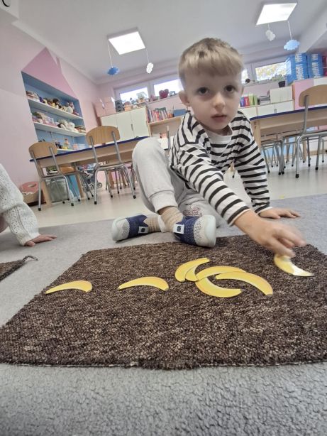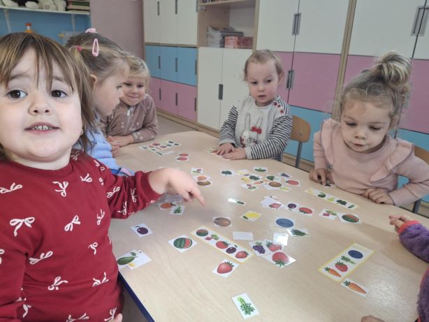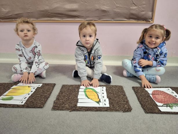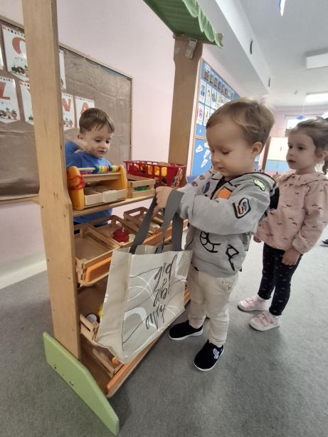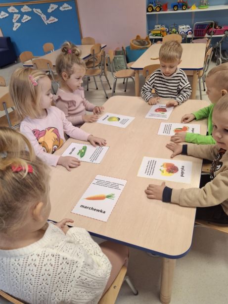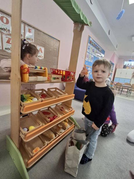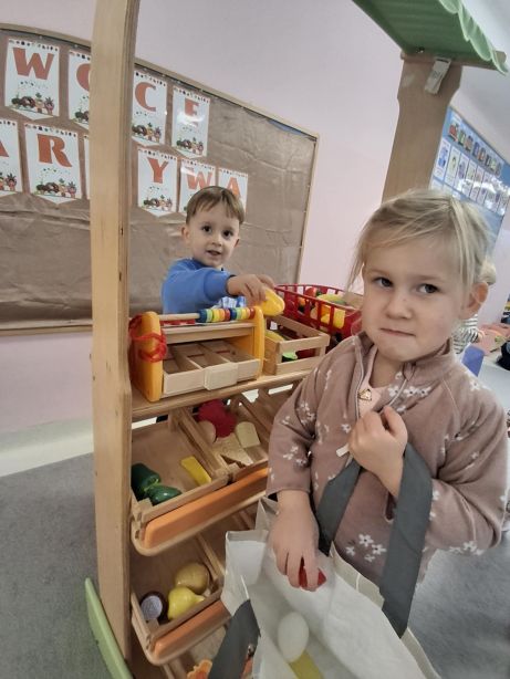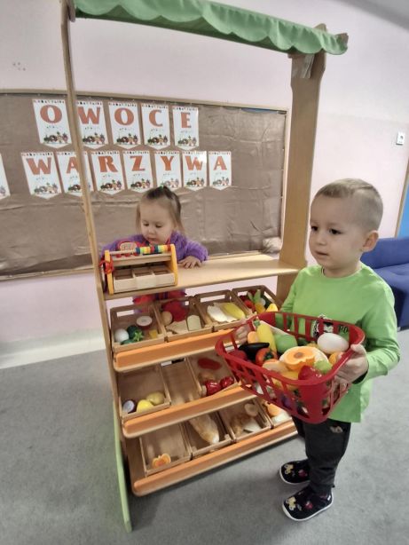 Na początku zajęć układaliśmy owocowo - warzywne puzzle, dzięki którym utrwalaliśmy ich kształty i kolory. Potem wybraliśmy się na zakupy do naszego przedszkolnego straganu - każde dziecko mogło zostać sprzedawcą lub kupującym. Uczyliśmy się jak wygląda robienie zakupów, przeliczaliśmy owoce i warzywa oraz doskonaliliśmy ich nazwy. Dzieci z wielkim zaangażowaniem brały udział w zabawach, a przy okazji przypomnieliśmy sobie, dlaczego warto jeść owoce i warzywa każdego dnia - bo są zdrowe, kolorowe i pyszne.
