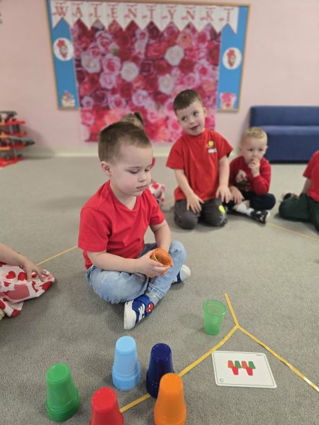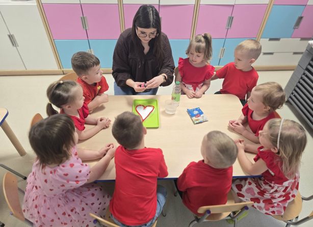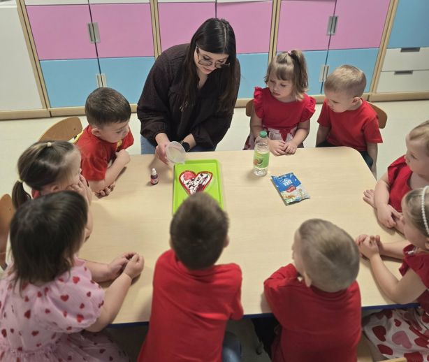 Nie zabrakło także kreatywnych zadań i ciekawych doświadczeń, które wzbudziły wśród przedszkolaków wiele uśmiechu i pozytywnych emocji. To był wyjątkowy dzień pełen zabawy, odkrywania i walentynkowej radości.