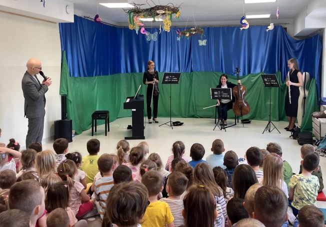 W dniu 24 kwietnia nasze przedszkole odwiedzili muzycy ze Szkoły Muzycznej w Busku-Zdroju. Spotkanie odbyło się w ramach cyklu zajęć rozwijających wrażliwość muzyczną i miało na celu przybliżenie dzieciom świata dźwięków oraz różnych instrumentów muzycznych. Na wiolonczeli, skrzypcach i flecie zagrali wybitni nauczyciele szkoły muzycznej, a na pianinie towarzyszył im pan Paweł Korepta, który pełnił również rolę konferansjera. Przedszkolaki z ogromnym zainteresowaniem słuchały koncertu, a muzyka klasyczna rozbudziła ich wyobraźnię, wrażliwość oraz ekspresję ruchową. Spotkanie miało na celu rozwijanie zainteresowań muzycznych wśród najmłodszych i kształtowanie otwartości na piękno sztuki.