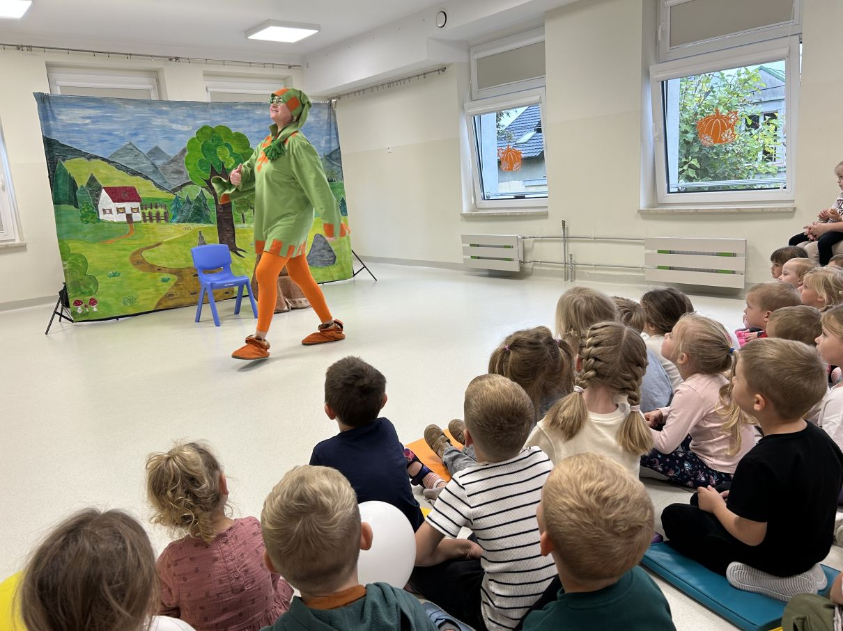 Dzieci z zainteresowaniem śledziły przygody wesołego Skrzata i babci. Barwne stroje, muzyka i kolorowe rekwizyty wprowadziły wszystkich w magiczny świat bajki.