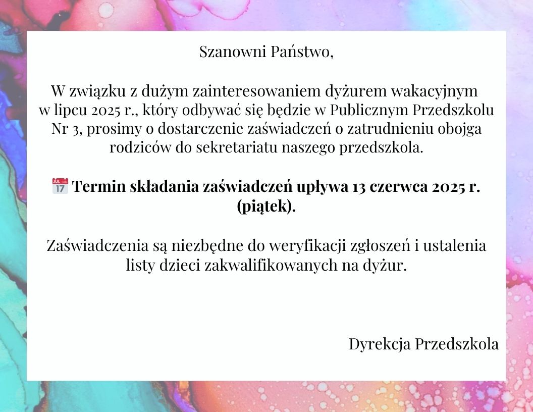 OGŁOSZENIE – DYŻUR WAKACYJNY W LIPCU 📢